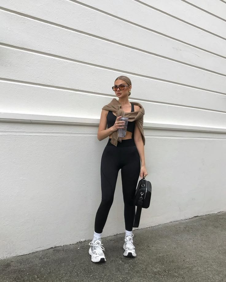 She’s in a sleek black matching set of a cropped tank and high-waisted leggings, giving full pilates-princess energy. A tan sweater tossed over her shoulders, white New Balance sneakers, and oversized sunnies make this the ideal coffee-run or athleisure day outfit.
