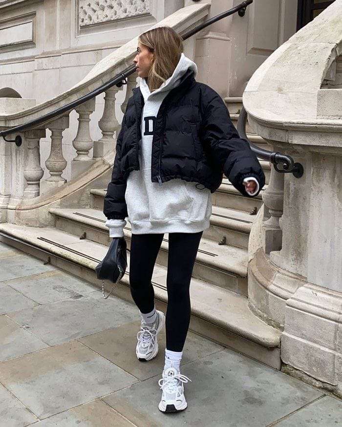 3. Sporty Puffer Jacket with Cozy Oversized Hoodie and Black Leggings