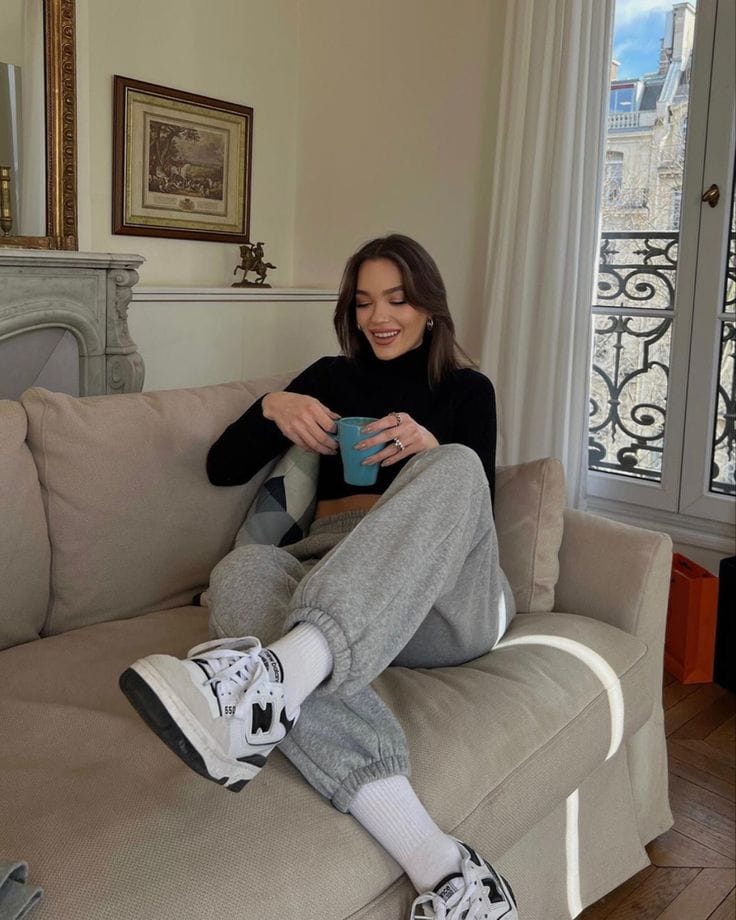 She’s curled up in a fitted black turtleneck and classic grey sweatpants, giving major “stylish but staying in” energy. Chunky New Balance sneakers, white socks, and dainty jewelry keep the look comfy but still super cute for a chill day at home.