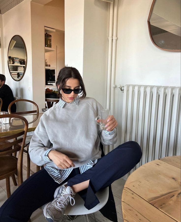 She’s lounging in a soft grey sweatshirt layered over a blue-and-white striped button-down, giving that effortless “I just threw this on” café vibe. Navy tailored trousers and classic New Balance sneakers keep it relaxed but still totally put-together for a casual day out.