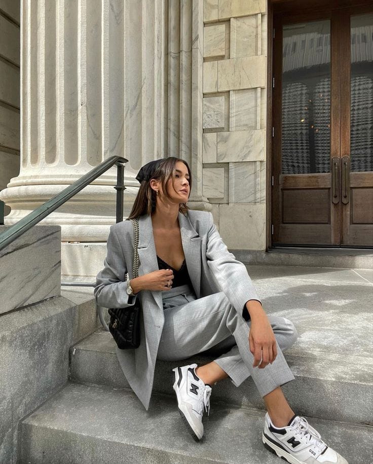 She’s serving power-dressed vibes in a light grey oversized blazer paired with matching tailored trousers and a peek of a black lace camisole underneath. Chunky New Balance sneakers and a quilted shoulder bag keep the whole look cool, effortless, and totally city-chic.