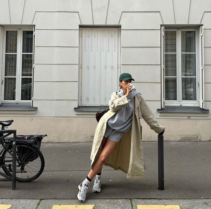 She’s rocking a light beige trench thrown over a matching grey hoodie and sweat shorts for that effortlessly chic coffee-run vibe. New Balance sneakers, ribbed socks, and a dark baseball cap keep the outfit sporty, balanced, and perfect for a casual city stroll.