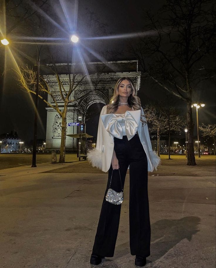 She’s giving Parisian chic in a luxe white satin top with an oversized bow, paired with a white blazer featuring feathered cuffs and classic black wide-leg pants. This look is all about dramatic elegance with a modern twist—seriously iconic for a night out!