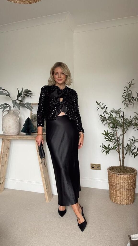 This look is so chic: a black sequin bow cropped top and styled with a sleek, ankle-length black satin skirt. It’s classic, sophisticated, and just perfect for dancing until midnight!
