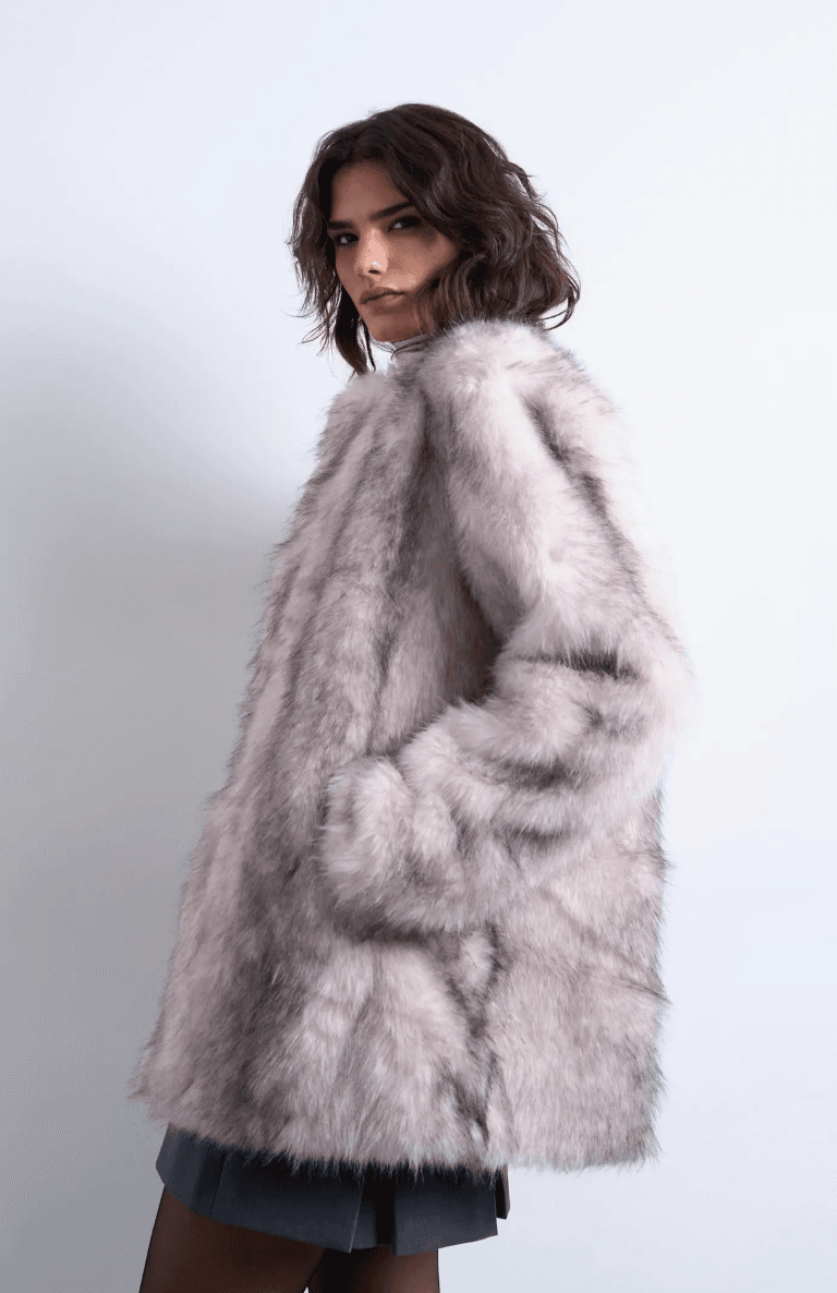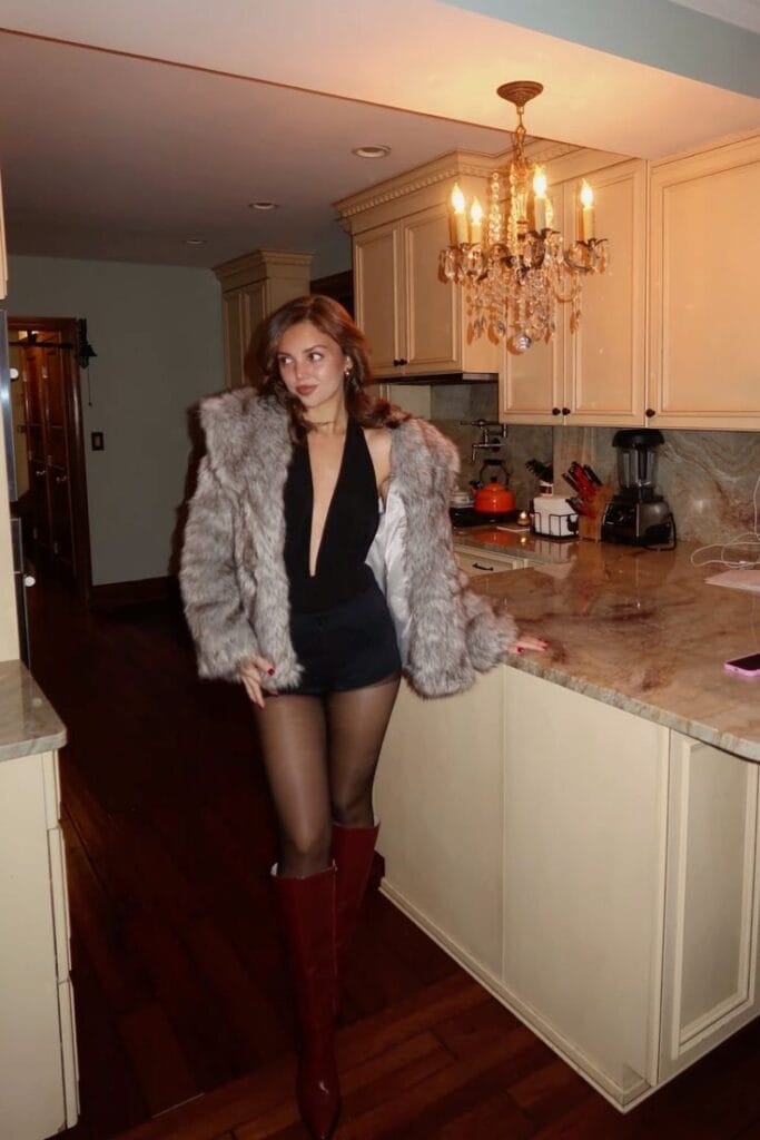 She’s owning the room in a plush faux fur coat layered over a daring black plunging bodysuit and high-waisted shorts—finished with sheer tights and tall burgundy boots for that ultimate luxe party vibe! This outfit is bold, cozy, and oh-so-glam for ringing in the New Year.