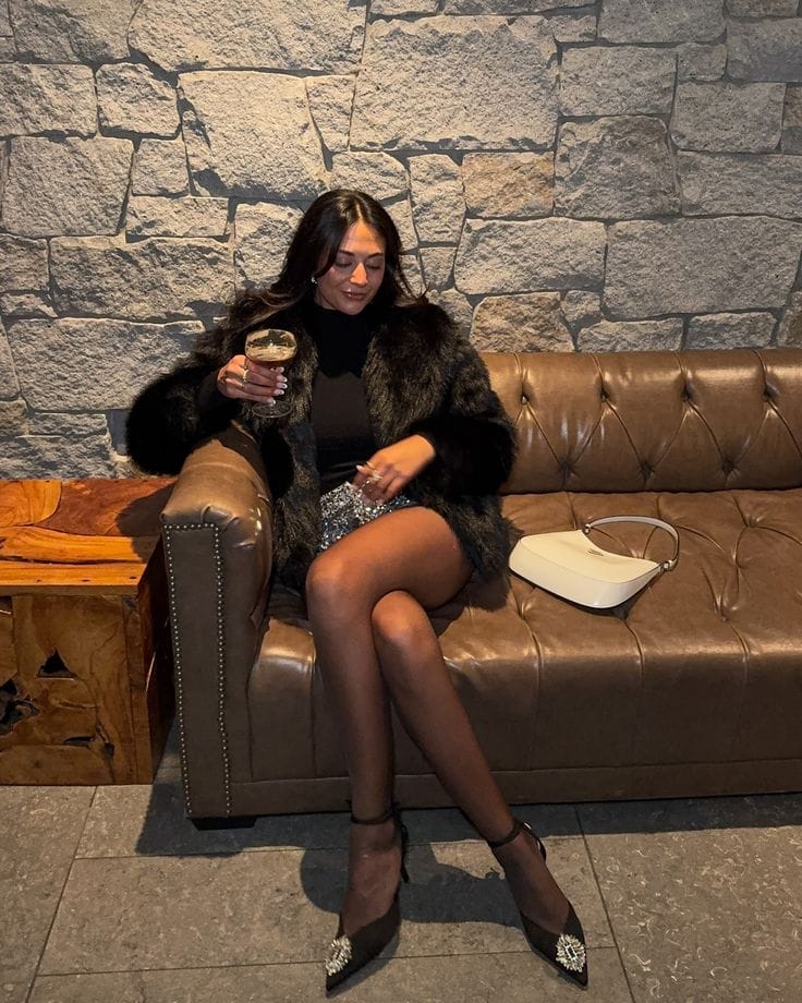 She’s channeling wintry glam in a plush brown fur coat layered over a sleek black top and a sparkly black sequin mini skirt—so extra and fabulous for a city night out! She finishes the vibe with sheer black tights, pointed heels, and a statement bag that brings the whole look together.