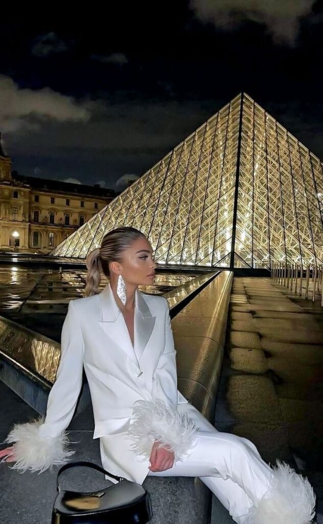 This outfit is giving Parisian cool with a dazzling light grey glitter blazer and black wide-leg pants, styled effortlessly with a sleek top and trendy sneakers. Honestly, who says you can’t be cozy and fab under the Eiffel Tower?