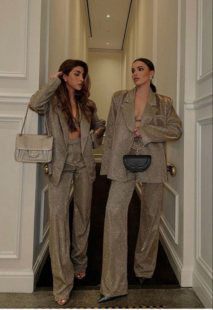 Both are rocking matching gold glitter suit sets, featuring wide-legged pants and oversized blazers—such a power move for any party! Whether worn with a bralette or styling the blazer open, it’s the definition of luxe and totally turns heads.
