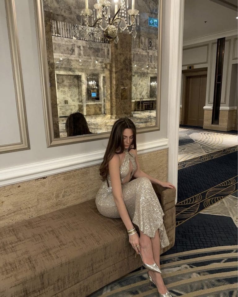She’s turning heads in a shimmery gold wrap mini dress with a plunging neckline, radiating major party vibes. The look is finished with strappy black heels—glam, bold, and perfect for a NYE celebration!