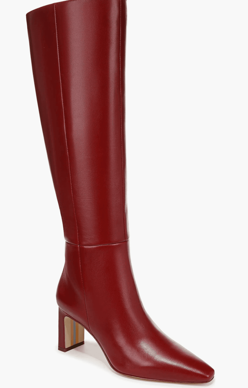 This party look features a minimalist black blazer dress paired with striking metallic gold knee-high boots for a bold, fashion-forward vibe. She adds dark accessories and a deep red bag for the finishing touch—effortlessly cool and NYE ready!
