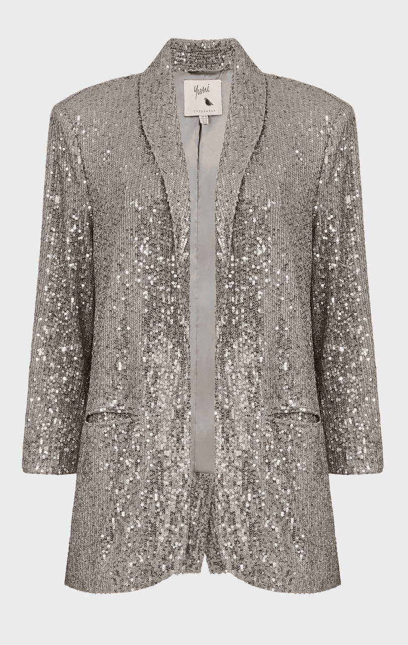 She’s sparkling in a stunning silver sequin crop top and matching mini skirt, layered with a slouchy grey jacket for extra edge. Silver pointed heels complete the vibe—shimmery, playful, and totally New Year’s party ready!