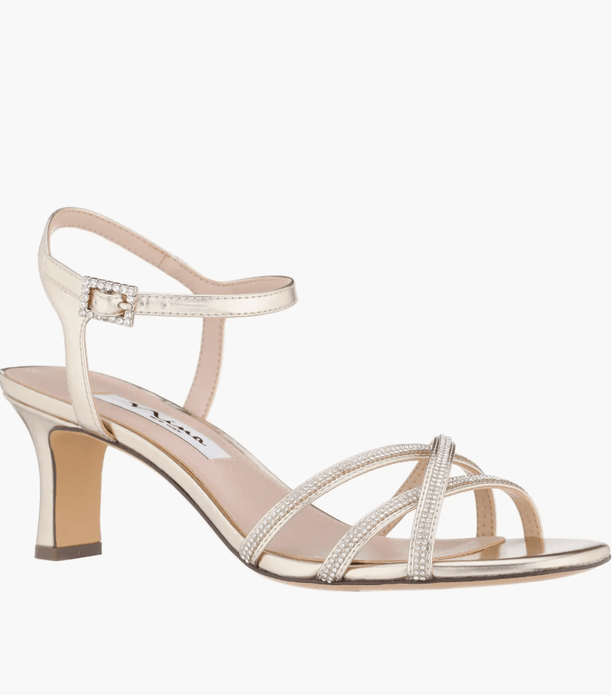 This gorgeous style features a champagne-hued, glittering sequin halter gown that’s giving total starlet energy. Metallic pointed heels and stacked bracelets add the perfect finishing touch for a dazzling New Year’s entrance!