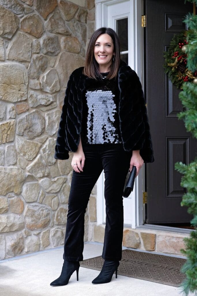 Go for ultimate luxe vibes with a black sequin top paired with velvet pants and a matching velvet coat.