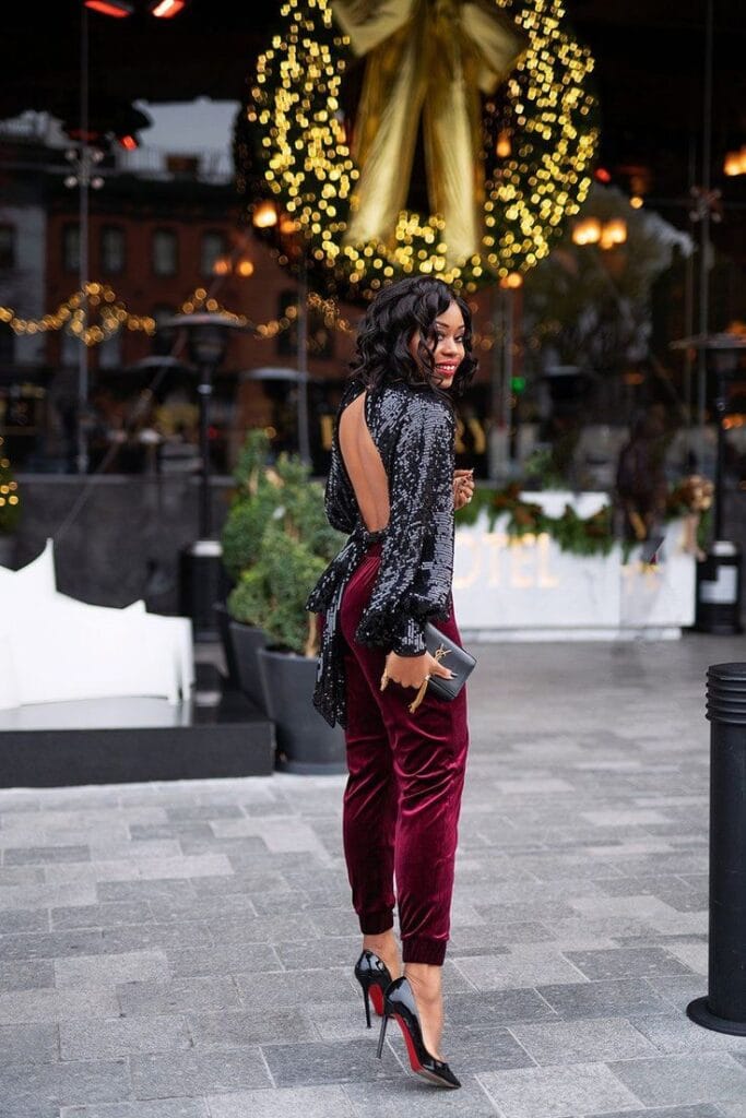 Add a pop of color to your festive outfit by pairing a black sequin top with bold red velvet pants.
