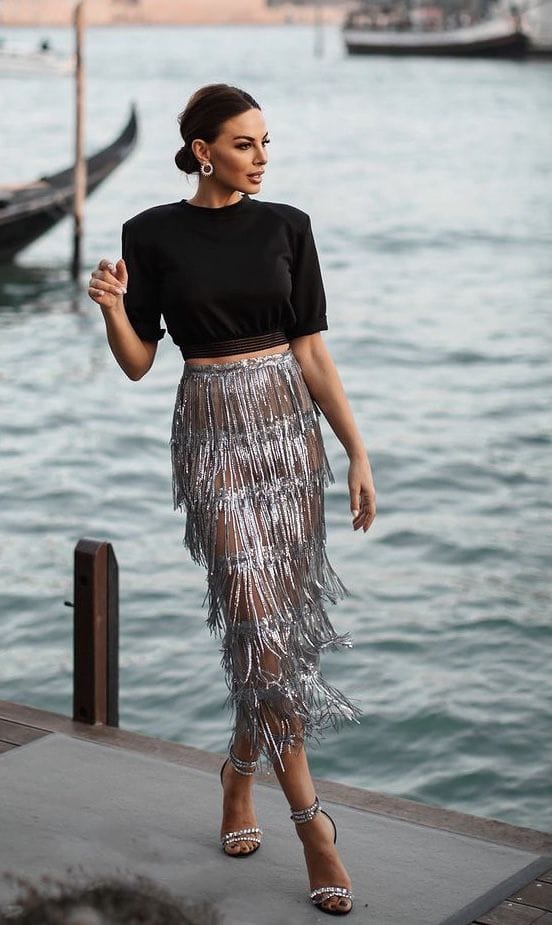 For a playful and flirty vibe, style a fringe trim skirt with a sleek black crop top.