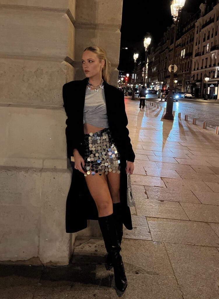 The sleek, monochrome look is elevated by the sparkle of the sequins, making it perfect for a chic and effortlessly cool New Year’s Eve outfit. Add bold accessories like a statement clutch or silver jewelry to complete the vibe.