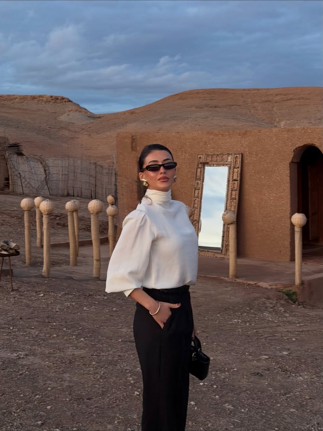 @ sherienboniHere it’s all about that crisp white high-neck blouse with soft, voluminous sleeves paired with tailored black trousers for effortless, quiet-luxury energy. Simple gold jewelry and a mini top-handle bag finish the look without stealing the focus from the clean lines and neutral palette.