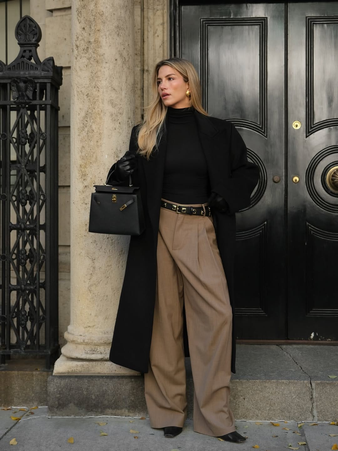 @ cassdimiccoShe’s in a fitted black turtleneck and camel wide-leg trousers, topped with a long black coat that instantly screams polished city elegance. Pointed black boots, leather gloves, a structured top-handle bag, and bold gold earrings make this look feel very CEO-off-duty and winter-luxe.