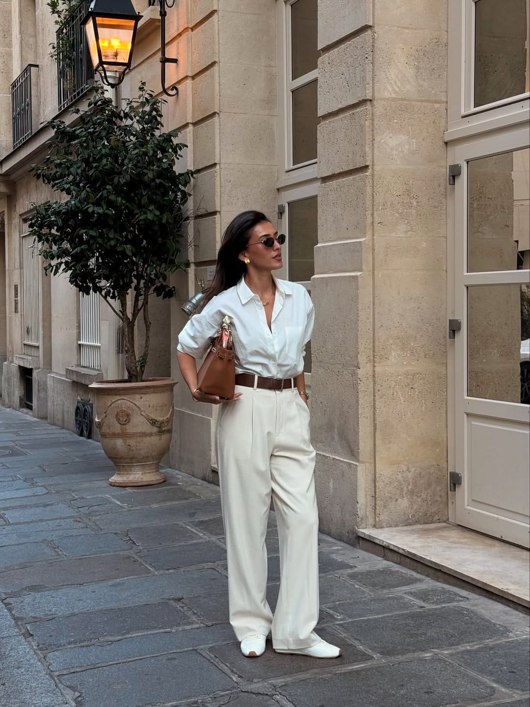 @ sherienboniShe’s wearing a relaxed white button-up shirt tucked into high-waisted ivory wide-leg trousers, cinched with a brown belt for that effortless Paris sidewalk chic. Minimal gold jewelry, classic sunglasses, and simple white flats make the whole look feel polished but still super easy to recreate.