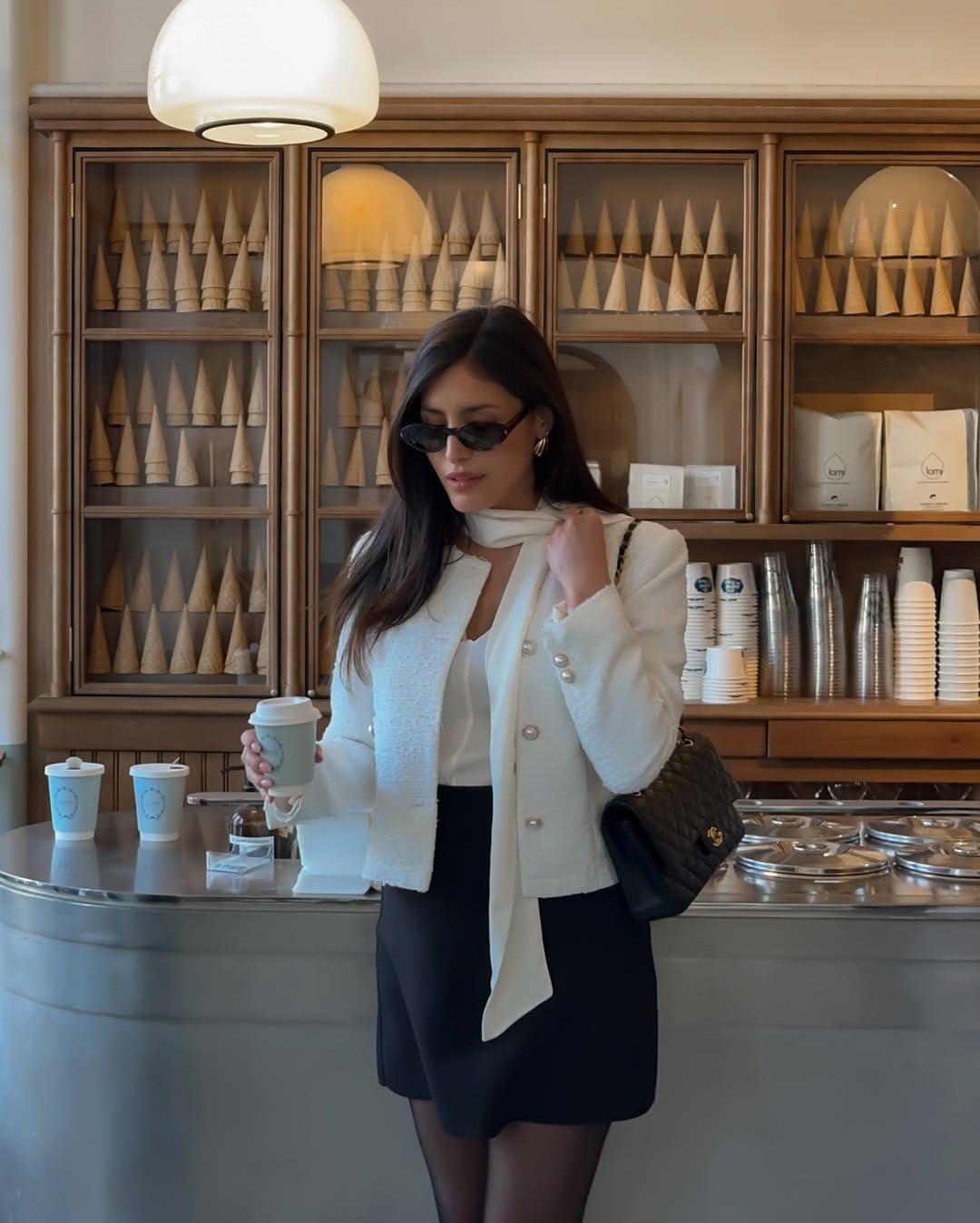 @ estheraguirreShe’s in a cream bouclé button-up jacket over a simple white top, paired with a classic black mini skirt and sheer tights for that polished café date vibe. Cat-eye sunglasses, a slim scarf, and a quilted shoulder bag make the outfit feel chic, effortless, and perfectly city-ready.