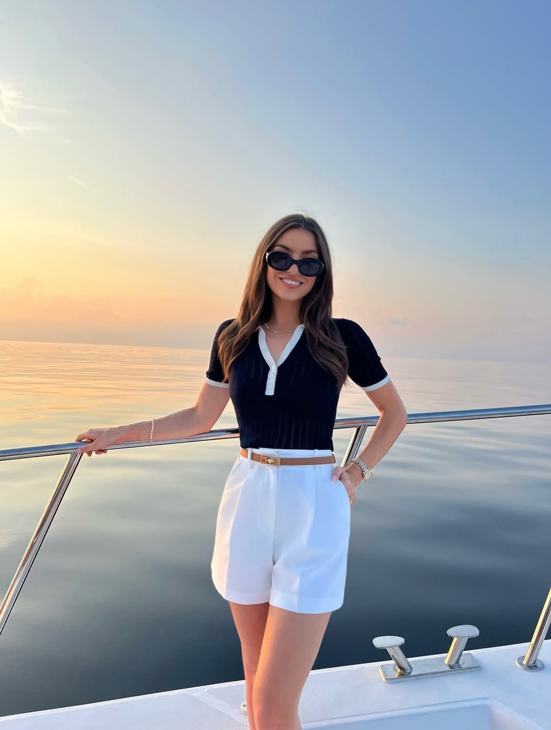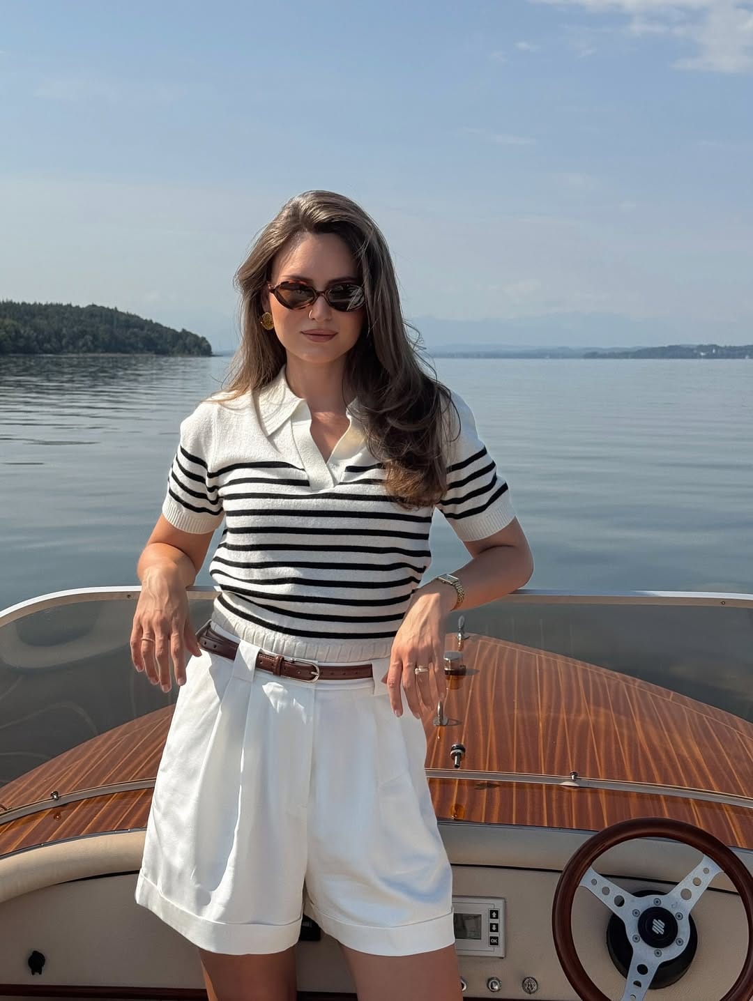 @ livia_auerShe’s in a navy-and-cream striped knit polo tucked into high-waisted white tailored shorts, cinched with a slim brown belt for that chic boat-day moment. Simple gold jewelry and loose hair keep it effortless, like you just hopped off a yacht and went straight to aperitivo.