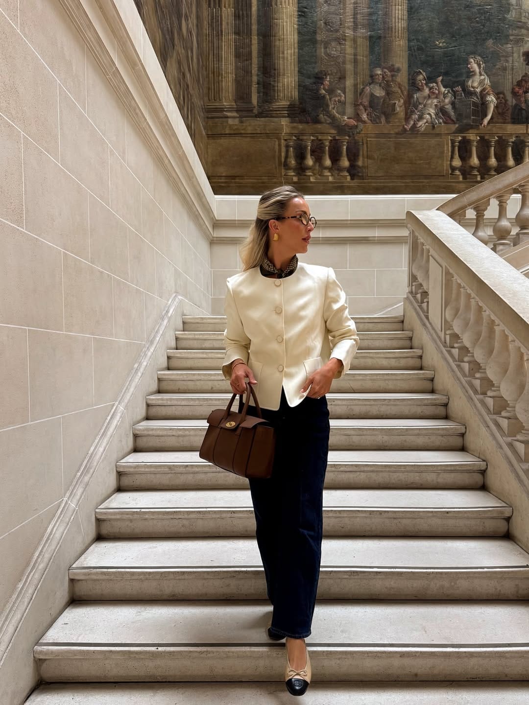 @ allchloeroseShe’s in a chic cream, collarless buttoned jacket over dark straight-leg trousers, keeping the palette timeless and polished. A structured brown top-handle bag, two-tone cap-toe flats, and subtle jewelry pull the whole old-money look together.