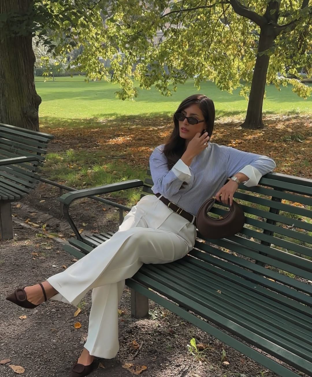@ estheraguirreShe’s lounging in a relaxed blue-and-white striped shirt half-tucked into high-waisted cream trousers, cinched with a dark belt for that low-key polished vibe. Brown slingback flats, a sculptural bag, and slim sunglasses make it feel very chic-Parisian-in-the-park.