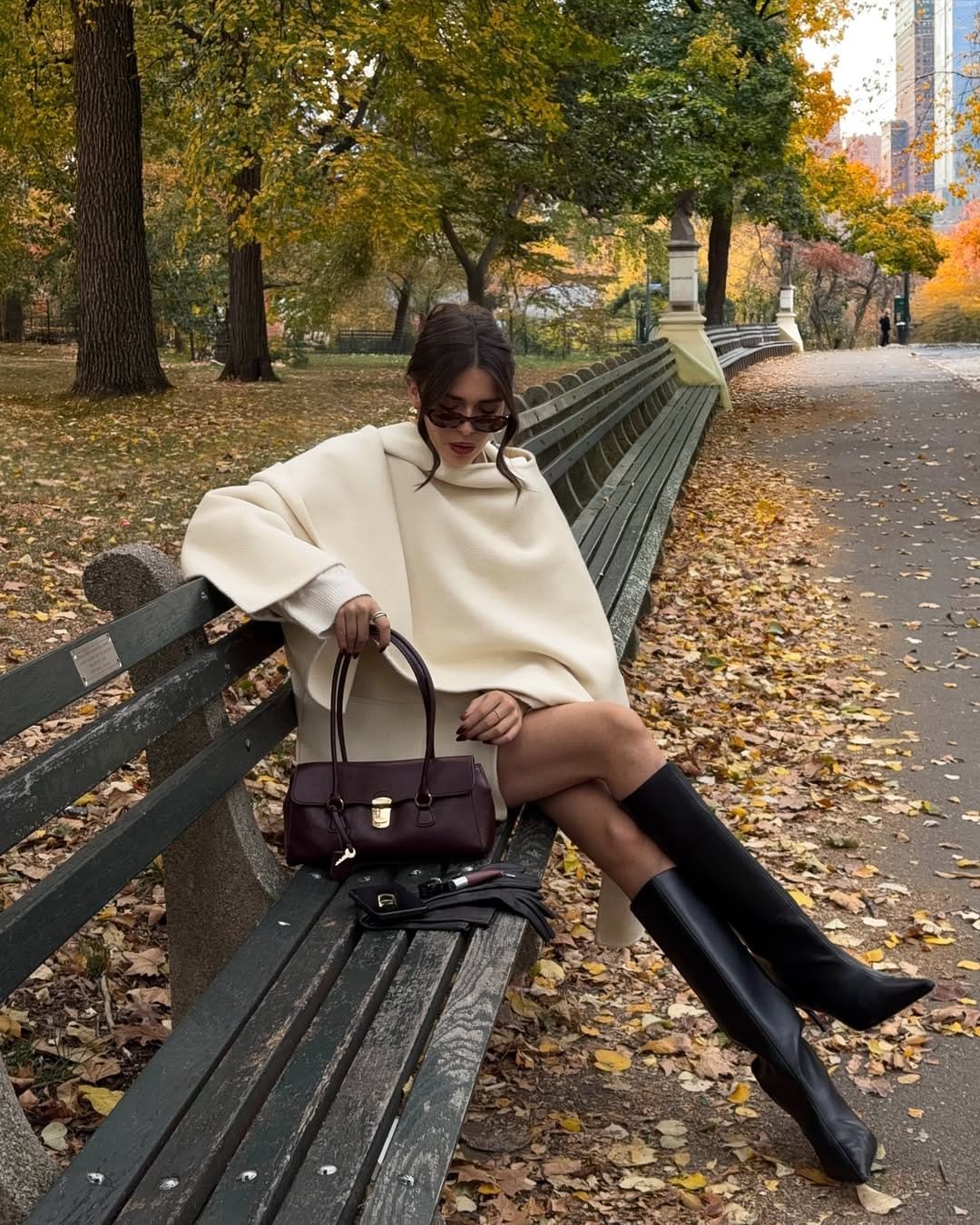 @ heloise.guilletShe’s cocooned in a soft cream cape layered over a matching mini skirt, giving that effortlessly polished fall-park vibe. Tall black riding boots, a deep burgundy handbag, slim sunglasses, and leather gloves on the bench keep it feeling perfectly old-money chic