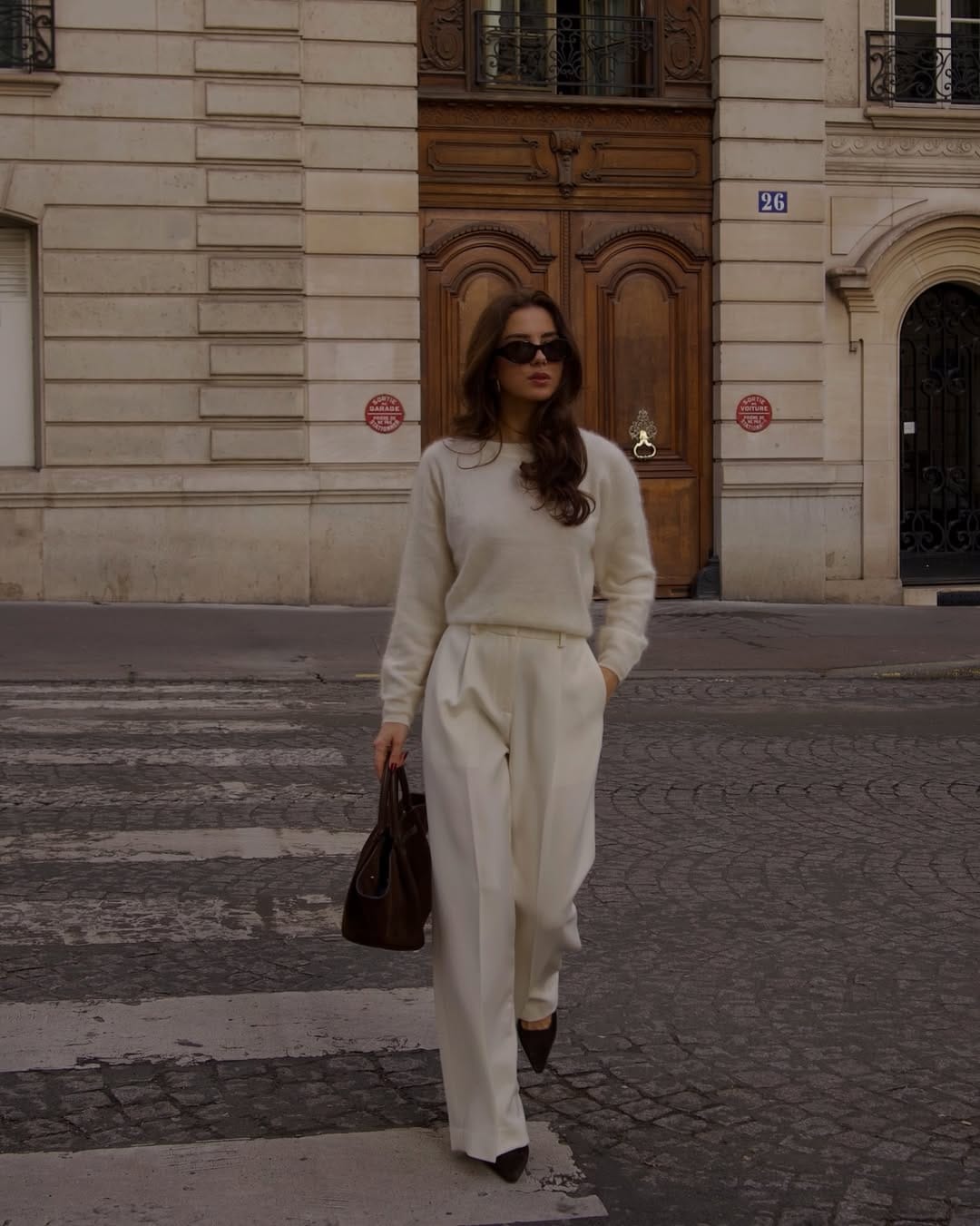 @ lucygrasssoShe’s in a soft cream knit tucked into high-waisted, wide-leg cream trousers for that long, clean, old-money silhouette. Pointed dark heels, a structured brown bag, and black sunglasses keep the neutral look feeling effortlessly elevated.