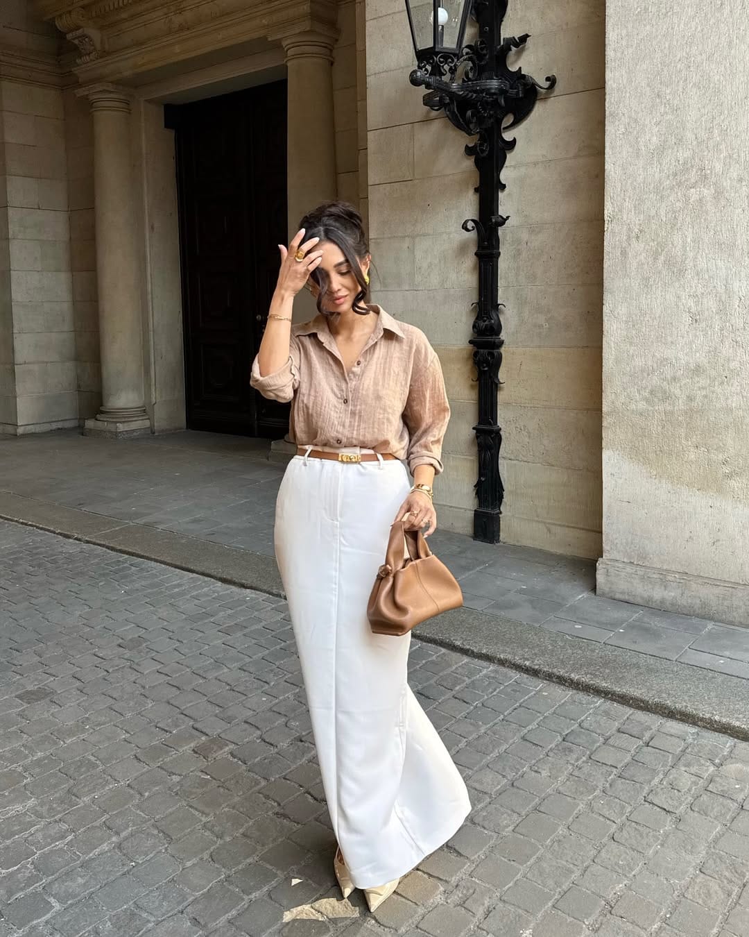 @ samira.sfiiiShe’s wearing a relaxed beige linen button-down tucked into a high-waisted ivory maxi skirt for that breezy, elongated old-money silhouette. Nude pointed heels, a tan belt, a sculptural bag, and dainty gold jewelry keep everything feeling quietly luxe and perfectly put together.