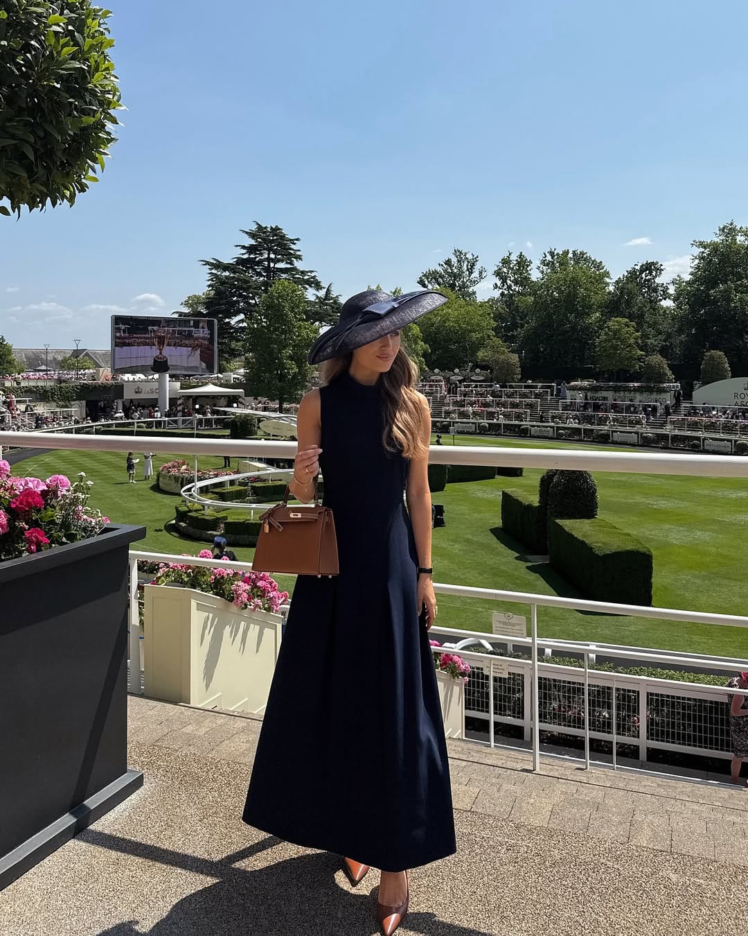 @ kateehutchinsShe’s in a sleeveless navy maxi dress that skims the floor, styled with a dramatic wide-brim hat for the ultimate race-day old-money moment. Pointed heels and a structured top-handle bag keep the look polished, while dainty gold jewelry adds just the right hint of sparkle.