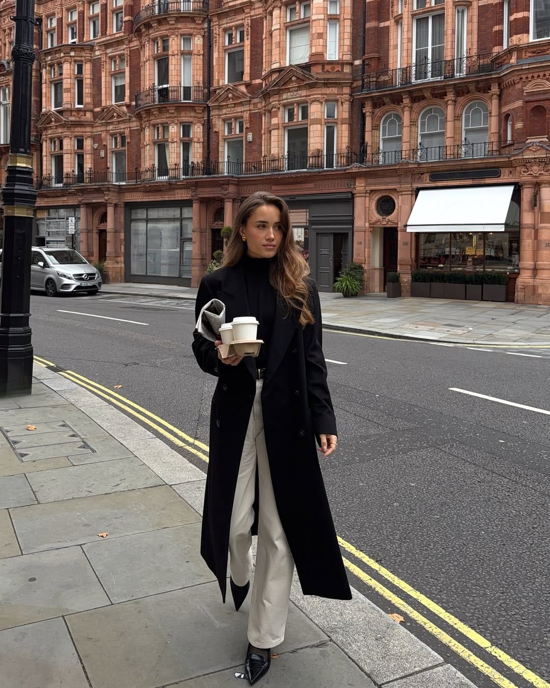 @ kateehutchinsShe’s wearing a sleek black turtleneck with cream tailored trousers, topped with a longline black coat that adds instant city-luxe drama. Pointed black heels, a structured belt, and a casually carried newspaper make this coffee-run outfit feel straight out of a chic London movie scene.