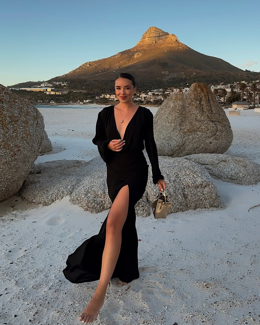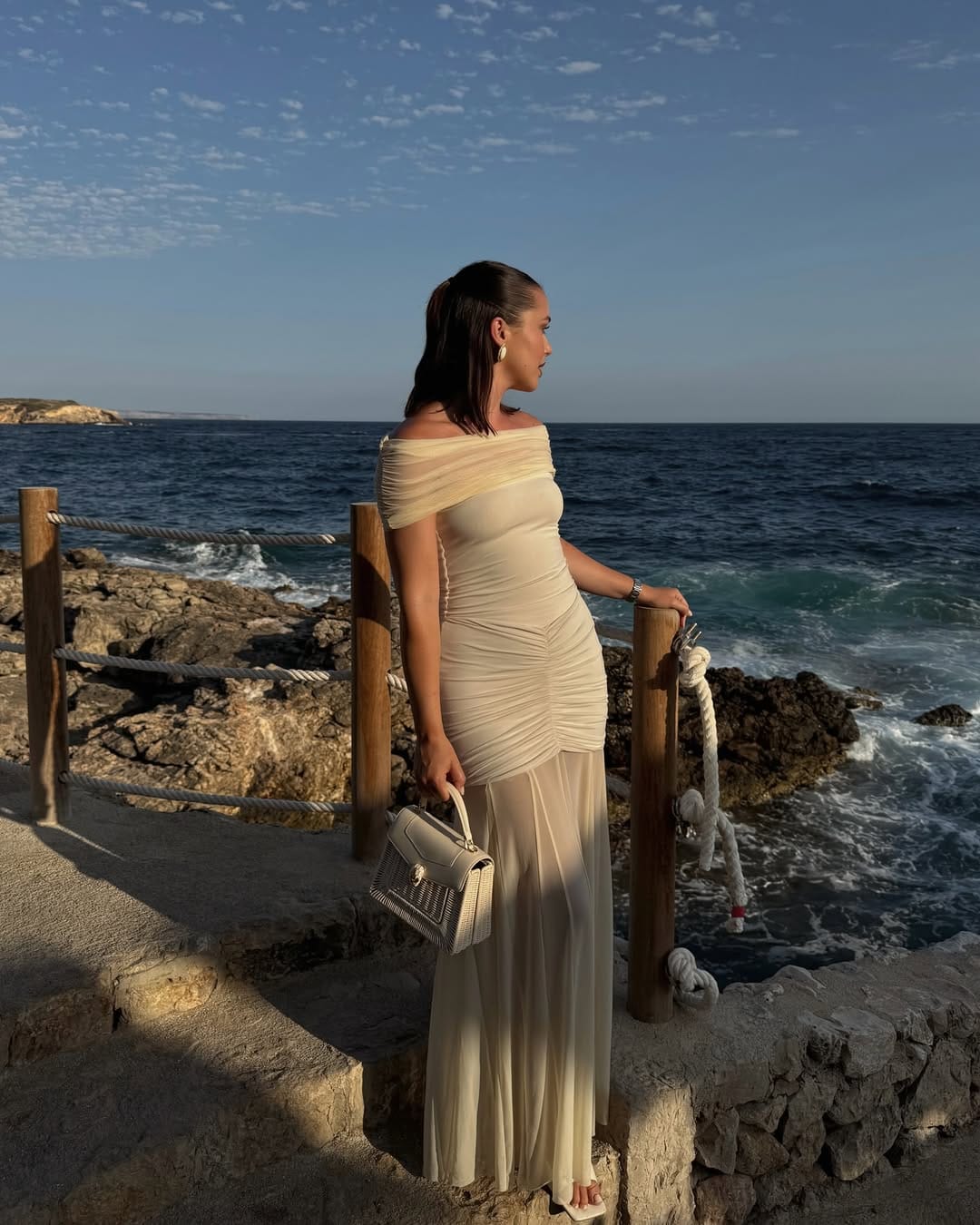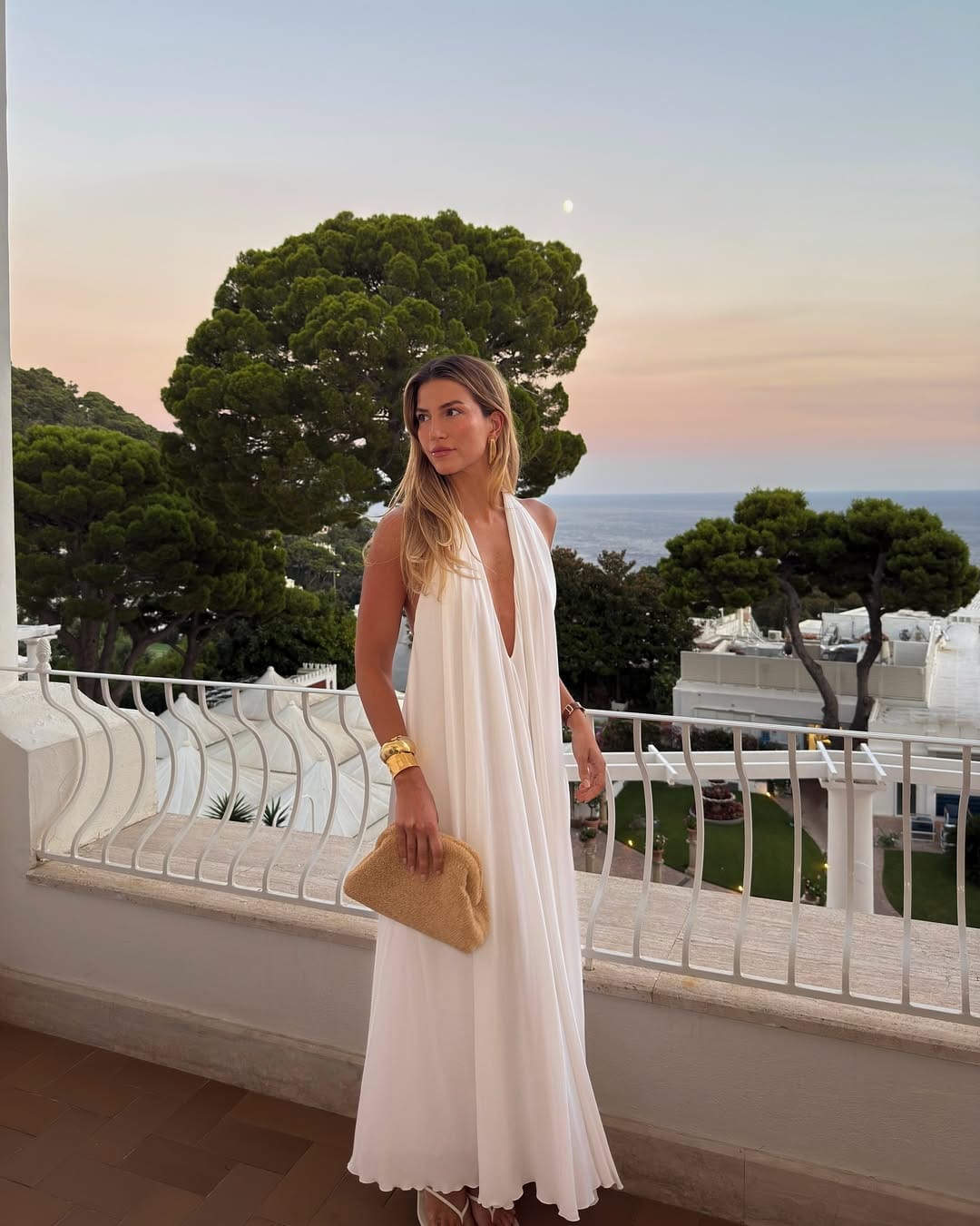 A breezy ivory halter maxi dress with a deep draped neckline creates an effortlessly elegant silhouette. The fluid fabric moves beautifully, giving the look a soft, ethereal feel—perfect for warm evenings by the coast. Styled with bold gold cuff bracelets and a textured woven clutch, the outfit balances minimalism with statement accessories for a refined yet relaxed sunset ensemble.
