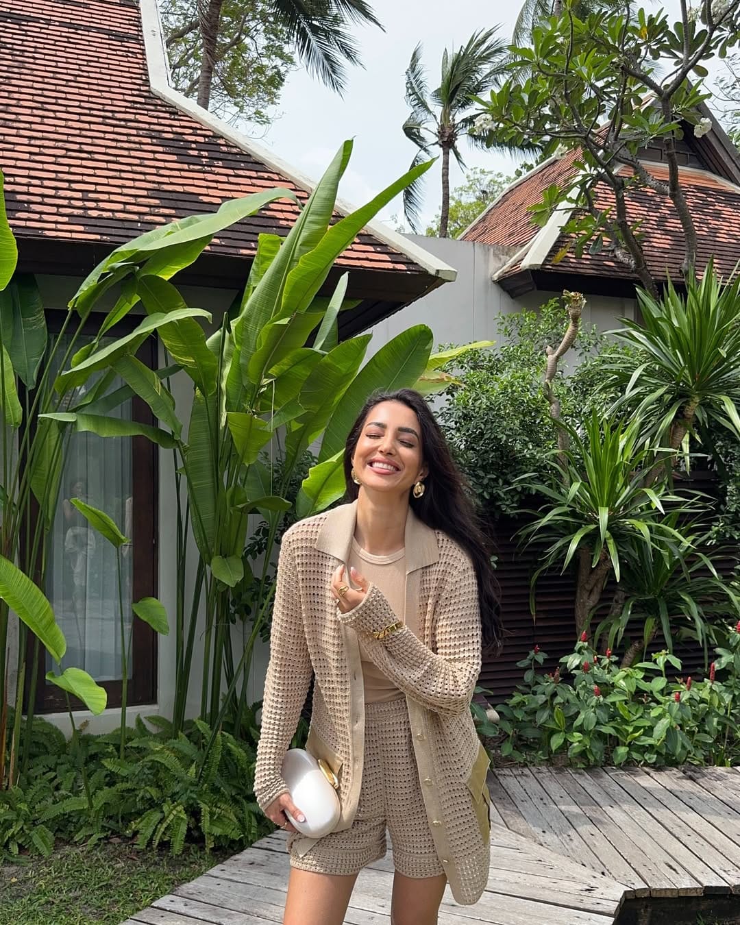 A monochrome beige knit set featuring tailored high-waisted shorts and a fitted top creates a sleek, cohesive base. Layered with a longline open-knit cardigan, the look feels relaxed yet elevated. Gold statement earrings, a matching bracelet, and a structured white clutch add polish, while the soft texture keeps it resort-ready and effortlessly chic.