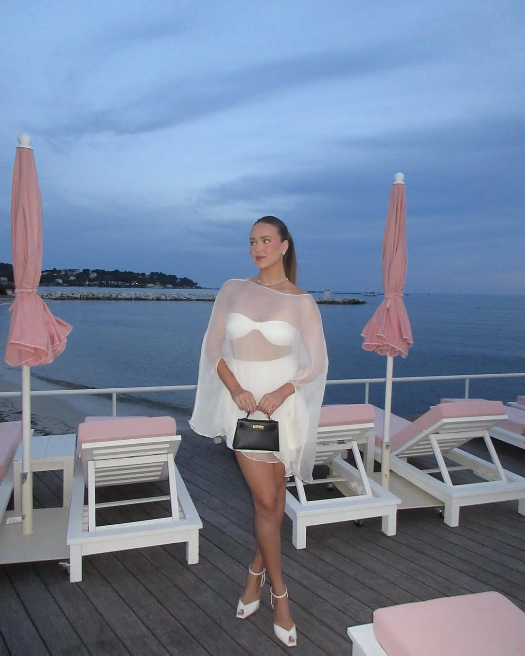 She’s wearing a sculpted white mini dress featuring a sweetheart bodice that contours the silhouette with a clean, modern finish. A flowing sheer chiffon cape overlay adds soft movement and an elevated, romantic dimension to the look.