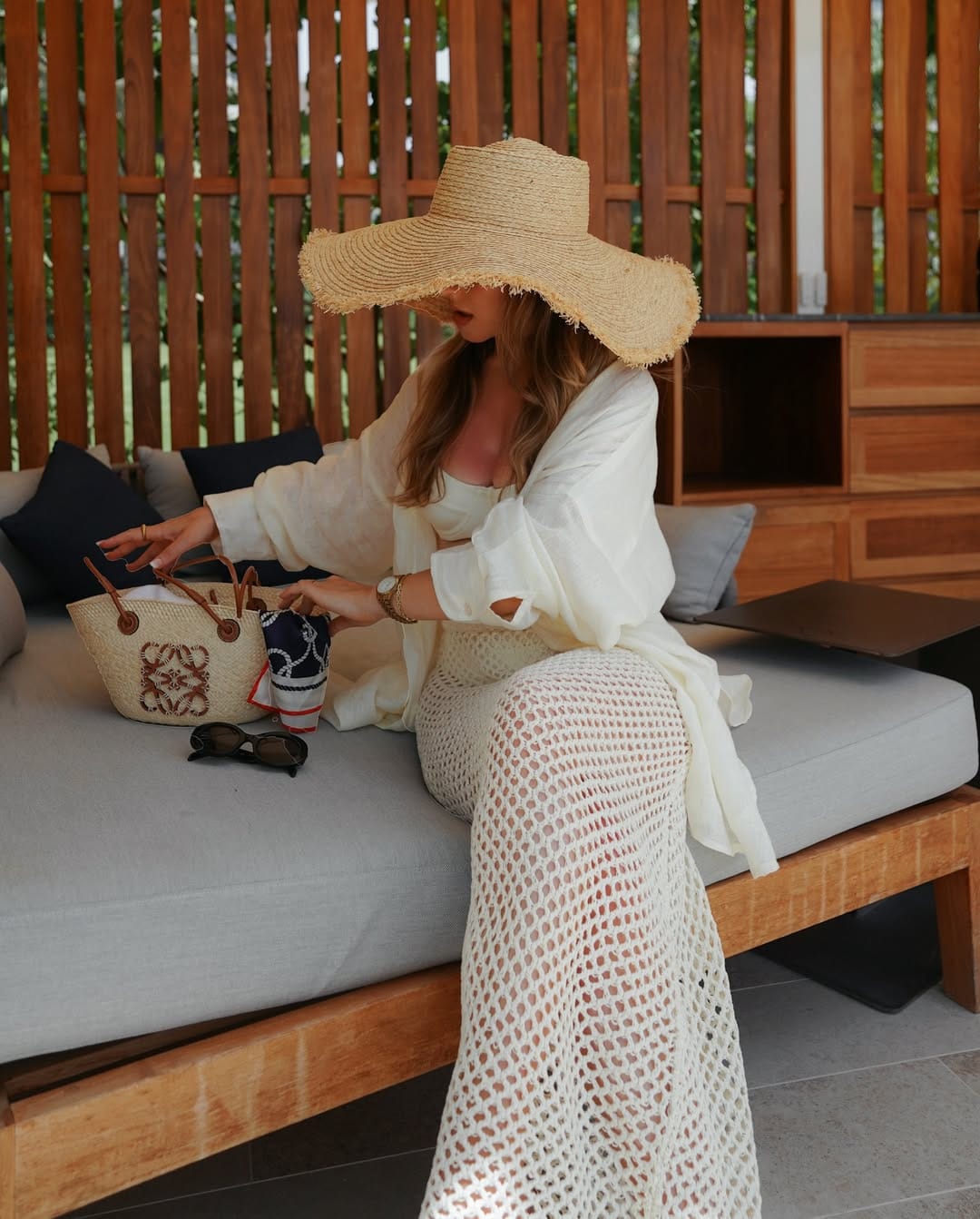 This relaxed resort ensemble centers on a high-waisted crochet maxi skirt in a natural cream tone, featuring a geometric open-knit pattern that creates a breezy, semi-sheer silhouette. This artisanal piece is layered over a simple white bikini set and paired with an unbuttoned, oversized white linen shirt that serves as a lightweight and effortless cover-up.