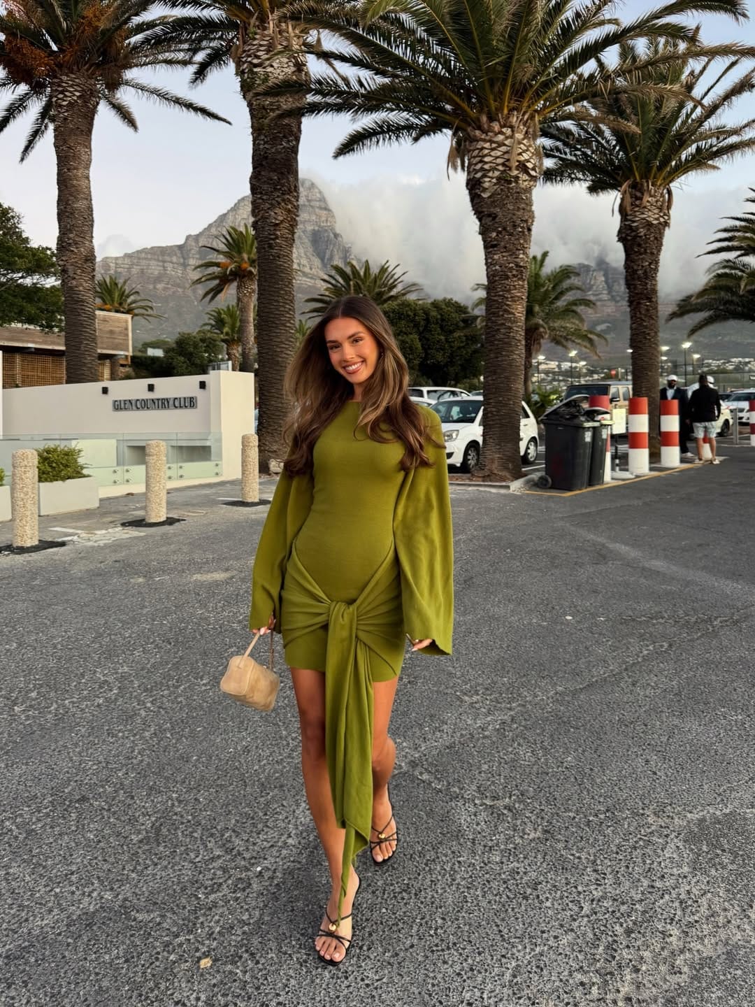 A striking olive green mini dress features a sleek, fitted silhouette balanced by dramatic flared sleeves. The standout detail is the front draped knot with cascading fabric, adding movement and a sculptural touch to the look. Styled with minimalist black strappy heels and a soft neutral mini bag, the outfit feels modern, confident, and effortlessly chic—perfect for an evening out in a warm, palm-lined setting.