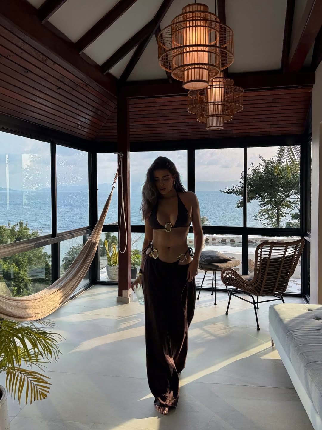 She’s wearing a rich chocolate halter bikini top with bold ring accents that give the look a luxe, sculpted feel.