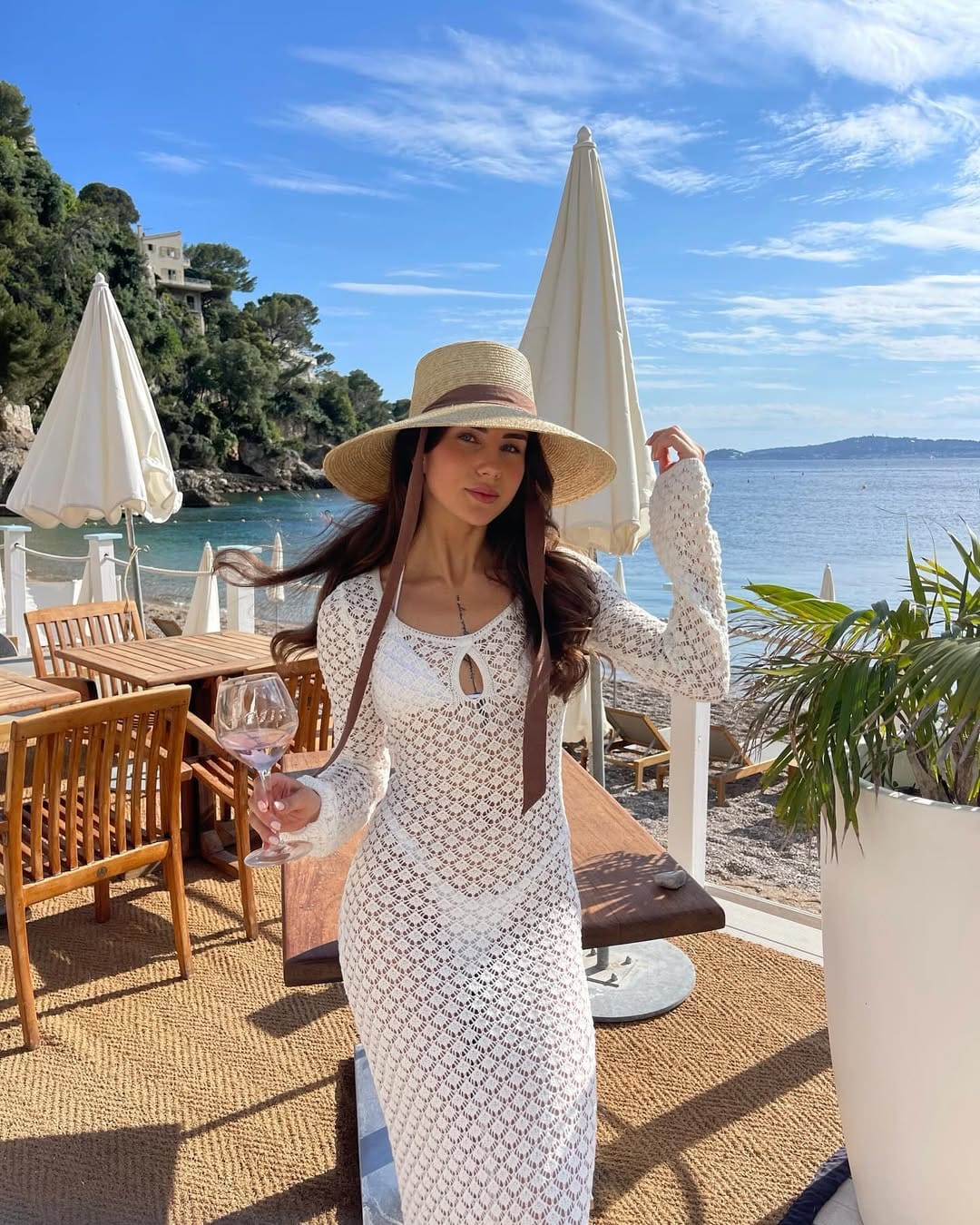 This vacation-ready look centers on an intricate, white long-sleeved crochet maxi dress featuring a chic keyhole cutout and flared bell sleeves. The sheer, open-knit design is layered over a crisp white triangle bikini set, creating a seamless and sophisticated monochromatic beach aesthetic.