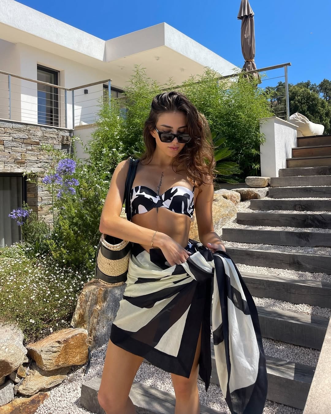 This modern resort ensemble features a striking black and white abstract-print bikini top paired with a coordinating geometric-patterned sarong. The lightweight wrap is tied at the waist, creating a sophisticated and effortless silhouette.