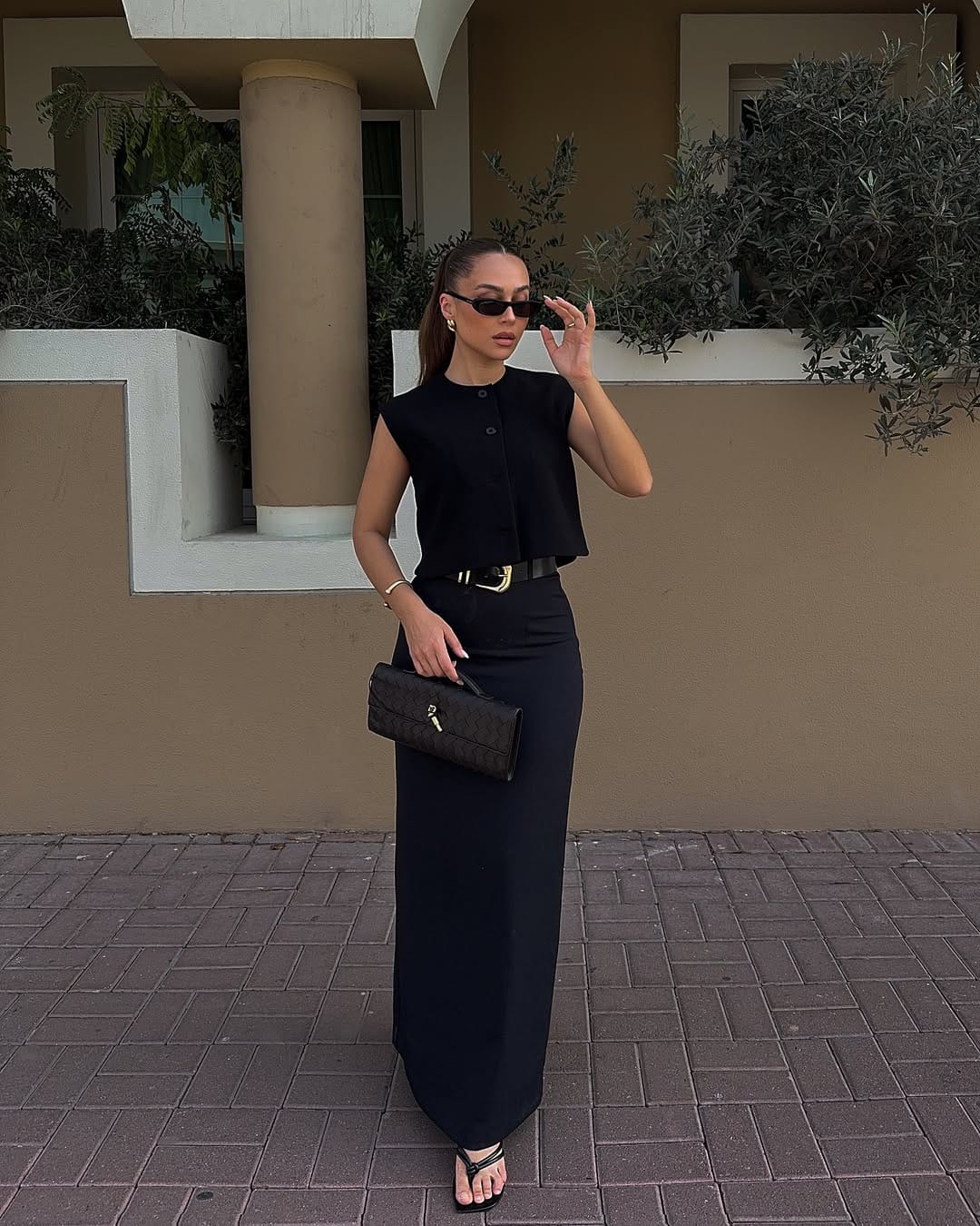 A structured black sleeveless top with a clean, minimal silhouette is paired with a high-waisted, figure-skimming maxi skirt. The streamlined tailoring and monochrome palette create a sharp, elongated look that feels modern and effortlessly sophisticated.