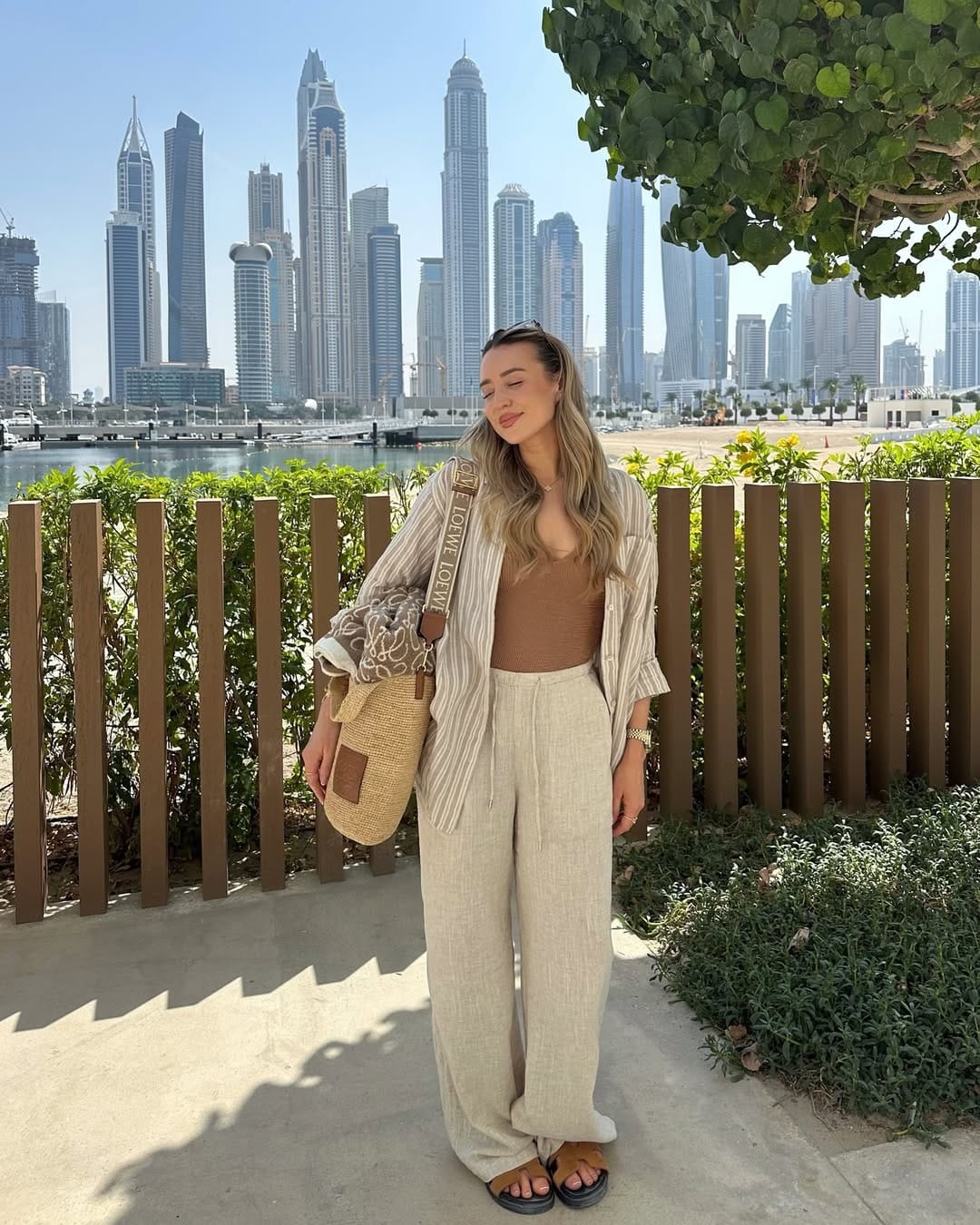 A lightweight striped button-down is layered over a fitted brown ribbed tank for an easy, sun-ready base. Flowing high-waisted linen trousers complete the look, adding soft structure and an effortlessly refined silhouette.