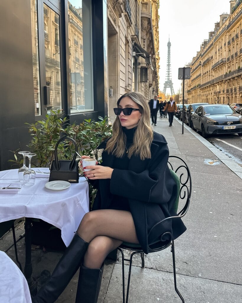 A black mini turtleneck dress layered with a sleek coat, sheer tights, and tall boots channels true Parisian elegance. This timeless combo is perfect for exploring the city with style and grace.
