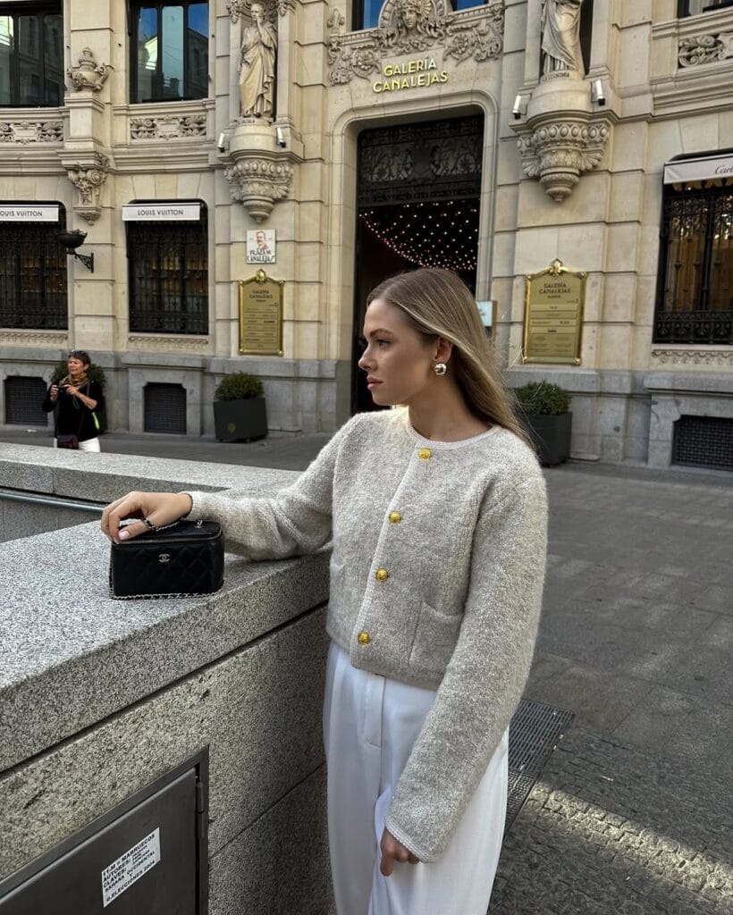 10. Elegant Cream Knit Cardigan & White Trousers
