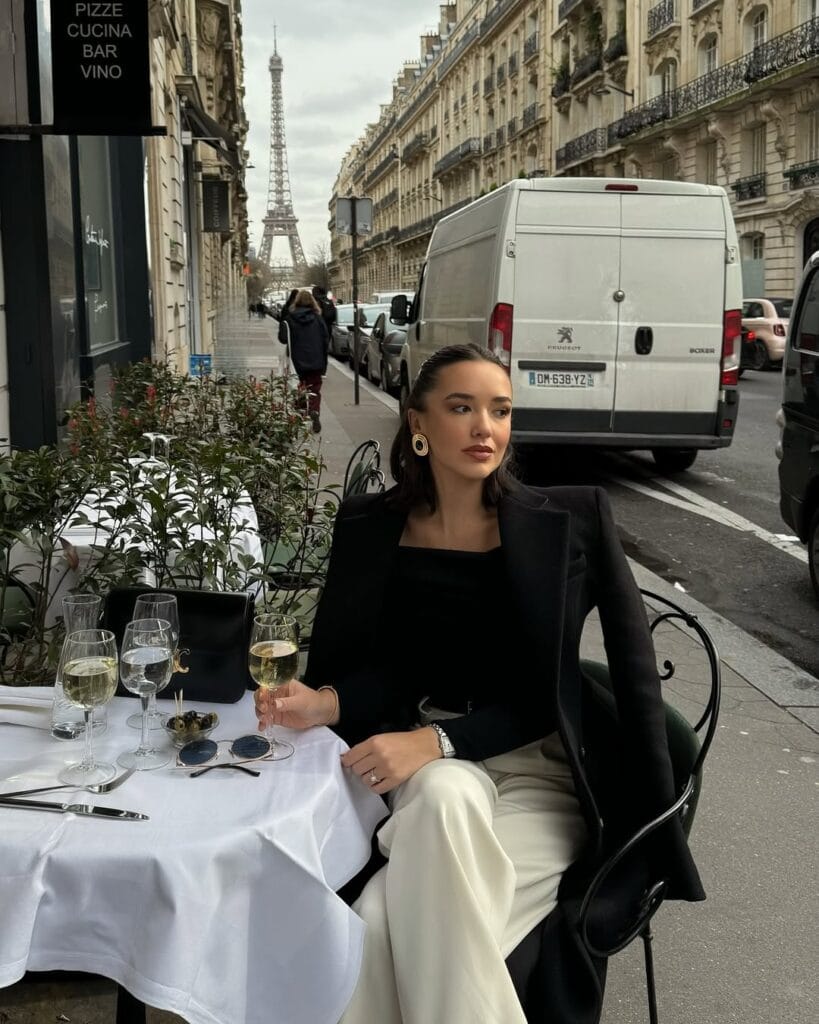 @ fleurraffanThis outfit just screams timeless elegance: a tailored black blazer over a fitted black top and high-rise cream wide-leg trousers. She adds a dash of gold jewelry and classic black accessories for that irresistible café style.