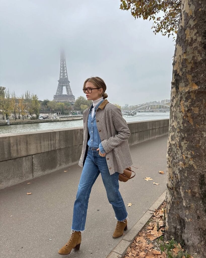@ elodieromyThis look is Parisian fall perfection: a checked tweed jacket over a classic blue denim shirt and straight-leg jeans. Brown lace-up boots and a white turtleneck keep things warm and casual for a stroll by the Seine.