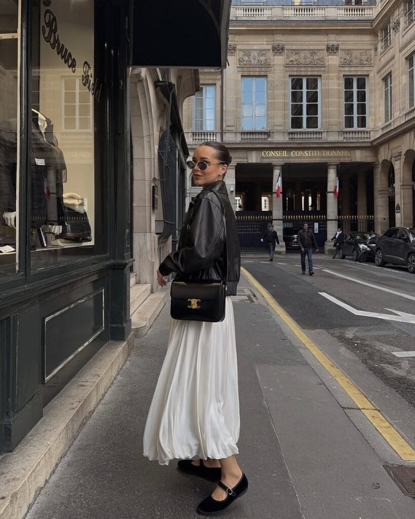 @ fleurraffanServing up modern romance with an edge, she pairs a cropped black leather jacket with a floaty, white pleated maxi skirt. The look is effortlessly chic, finished with black mary janes and a sleek shoulder bag.