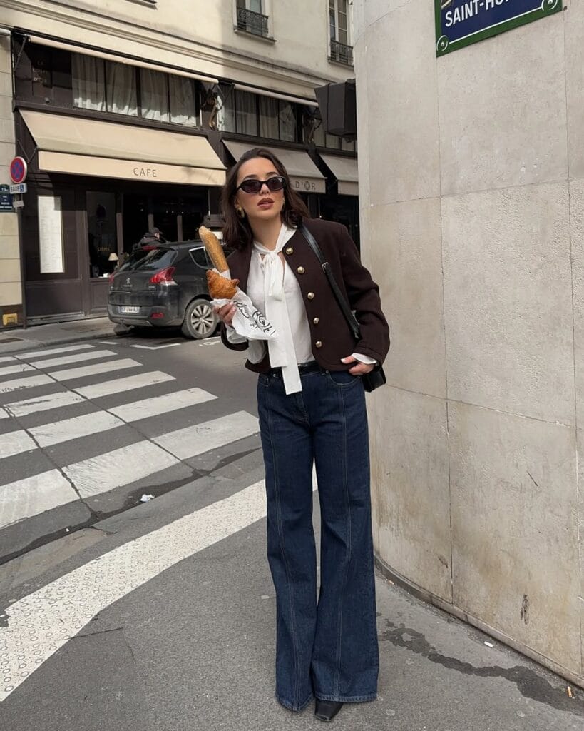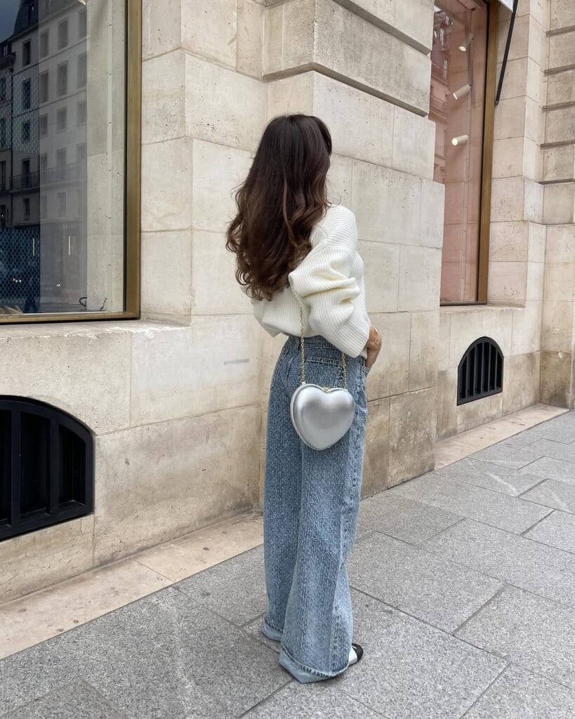 This cozy-chic combo features a creamy ribbed knit sweater half-tucked into loose, light-wash wide-leg jeans. It’s simple Parisian casual at its best—laid-back, comfy, and ready for a stroll through the city.