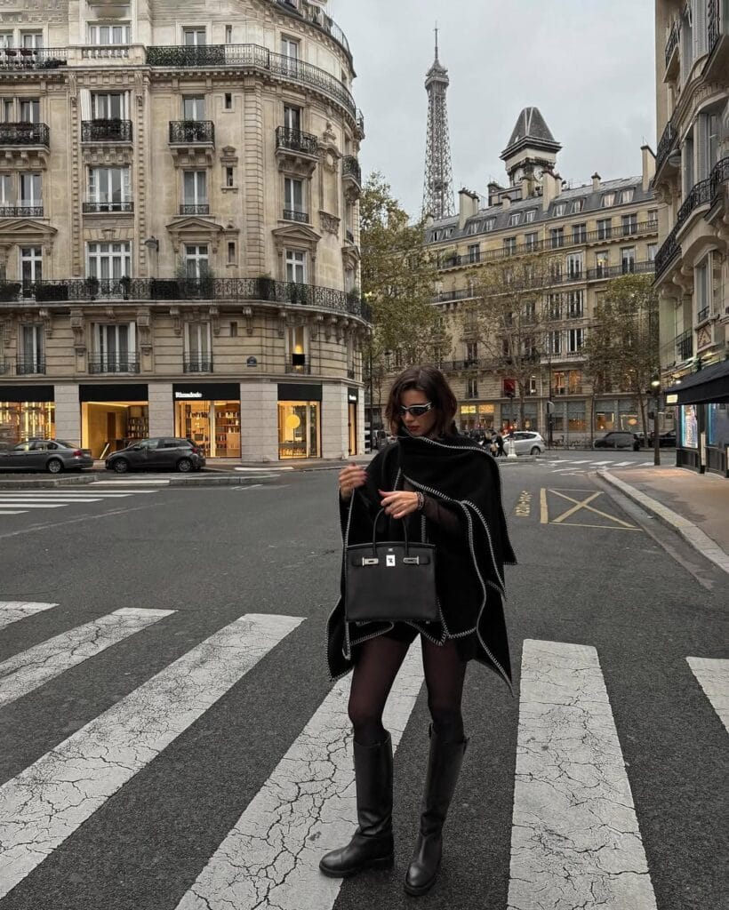 @ katie.oneThis striking Parisian look pairs a dramatic black cape with a black mini dress and sheer tights. Tall black boots pull it all together, making for the ultimate cool-girl crossing.