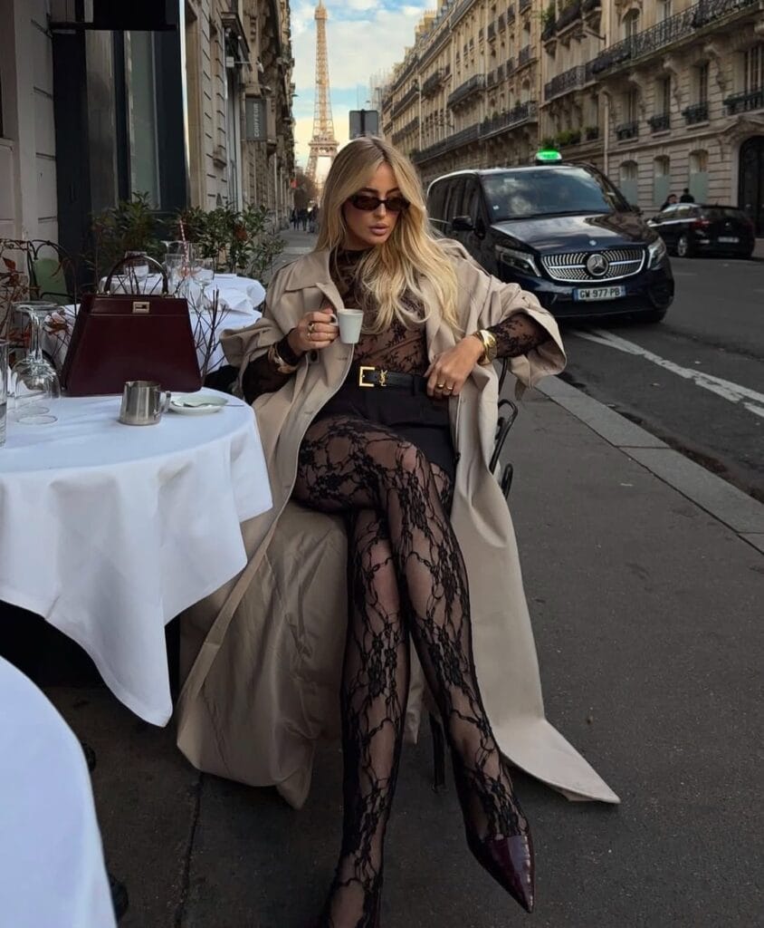 @ franziskanazarenusThis look is pure Parisian glam: a long beige trench coat thrown over a sheer black lace bodysuit and high-waisted black shorts. She kicks it up a notch with striking lace tights and glossy pointed heels for a statement café moment.